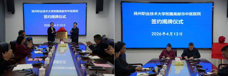 4月13日上午,医学院与高邮市中医医院共建扬州职业技术大学附属医院签约揭牌仪式在高邮市中医医院举行。学院党总支书记卢子华、院长熊彦,高邮市中医医院党委书记唐炳群、院长陈兴兵及校院双方相关负责同志出席活动。仪式由高邮市中医医院院长陈兴兵主持。双方以此次签约揭牌为契机,进一步深化城校合作,推动医教协同发展,携手打造集人才培养、临床教学、科研创新于一体的高水平合作平台。